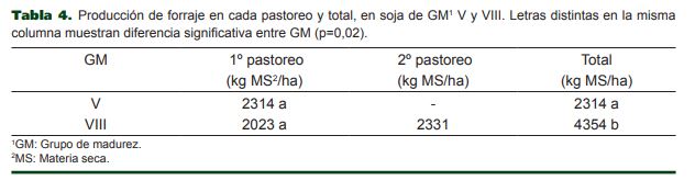 En el primer pastoreo no se observó diferencia de producción forrajera entre ambos GM (p=0,26). No obstante, la producción total de forraje de la soja de GM V fue 47 % menor que la soja de GM VIII (p=0,02; Tabla 4).