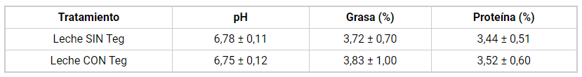 Tabla 1. Calidad composicional (pH, contenido de grasa y proteína) de las muestras de leche de vacas lecheras suplementadas con tegumento de maní (media ± D.E.)