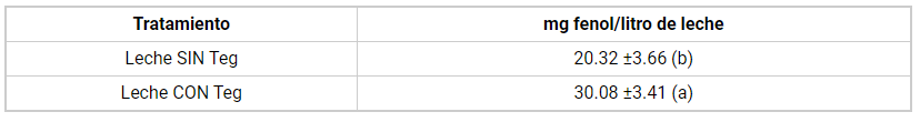 Tabla 2. Contenido de antioxidantes (miligramo de fenol por litro de leche), en muestras de leche de vacas lecheras suplementadas con tegumento de maní (media ± E.E.).