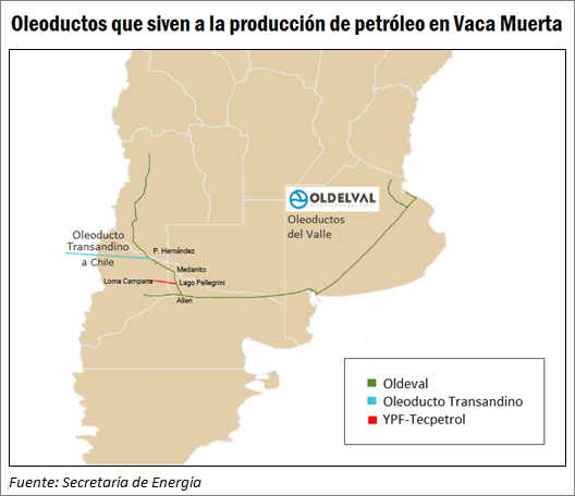 Sistema de Oldelval (Oleoductos del Valle) desde Puerto Hernandez a Bahía Blanca: transporta el 70% del petróleo que se origina en la Cuenca Neuquina, hacia Bahía Blanca, se identifica con el trazado verde en la imagen. Con 1700 kilómetros de ductos operados, el sistema posee una capacidad de 158.000 barriles diarios. Actualmente, presenta un 25% de capacidad ociosa