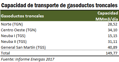 En Argentina existen dos empresas que operan y administran los gasoductos troncales del país: Transportadora de Gas de Norte (TGN) y Transportadora de Gas del Sur (TGS); además hay nueve compañías distribuidoras de gas en el territorio nacional. De acuerdo a la información de Enargas, los cinco gasoductos troncales – tres de ellos en el sistema TGS y dos en TGN – tienen un recorrido de 15.923 km y una capacidad diaria de 149,77 MMm3/día.