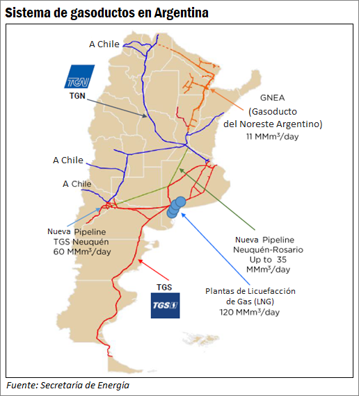 Además, al definirse el objetivo estratégico del desarrollo de los recursos no convencionales de Vaca Muerta, esto necesariamente implica contar con la infraestructura de transporte para la exportación de gas. El consumo interno en los meses de invierno no justifica la inversión en la formación neuquina. Asimismo, las reservas de hidrocarburos presentes en Argentina podrían convertir al país en el mediano y largo plazo en un oferente clave de excedente de gas. En consecuencia, la necesidad de infraestructura emerge para muchos especialistas como urgente.
