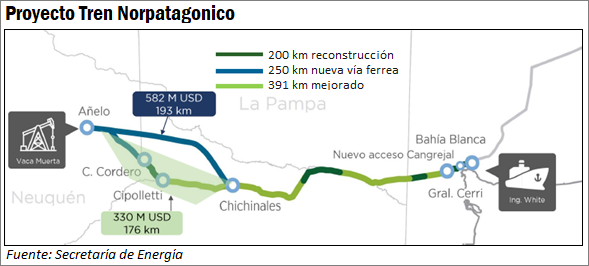 El ferrocarril Norpatagónico serviría a conectar la ciudad de Añelo –en el corazón de Vaca Muerta- con Puerto Galván en Bahía Blanca. El proyecto constituye una obra clave para bajar costos y acelerar tiempos de operación. La línea férrea serviría tanto para la salida de la producción como para el ingreso de insumos como arena, tubos, cemento, etc. La puesta en funcionamiento de esta línea requiere obras de mantenimiento en gran parte del trazado y también la construcción de tramos completamente nuevos. En el planeamiento del ferrocarril se contemplaron 90 vagones especiales para el transporte de cargas. Según datos de la Secretaría de Energía, la puesta en operación del tren demandará US$ 1.285 millones. Sin embargo, el proyecto enfrenta, por un lado, un elevado costo crediticio en Argentina y, por otro, el riesgo de que las cargas efectivamente realizadas no alcancen para repagar el desarrollo.
