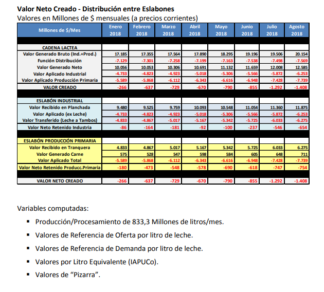 Expresa la capacidad de pago por litro de leche cruda por parte de las industrias, en condiciones normales de operación y para una situación de “nivelación” en los resultados de la empresa, esto es, sin margen de renta alguno (o renta cero). Para su determinación se detraen del “valor generado” (en planchada) por la totalidad de los productos lácteos elaborados a partir del procesamiento de los volúmenes de leche cruda producidos y remitidos por los tambos, el “valor aplicado” por la industria para disponer del resto de los factores y recursos necesarios para su elaboración. Los “instrumentos” con que realiza las observaciones son modelos de simulación que interpretan los procesos de producción implicados desde la tranquera del tambo hasta la “planchada” de fábrica. Cuatro tipos de modelos interpretan las actividades industriales que convierten la materia prima básica (leche cruda) en productos puestos “en planchada” de fábrica: – Modelos Tipo I – de “Generación de Valor”. Explican la función técnica de producción de cada uno de los productos específicos observados. Miden el volumen de producción a partir de los litros de leche cruda destinados a cada uno de ellos.
