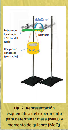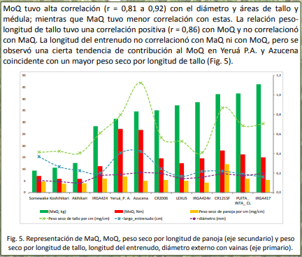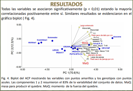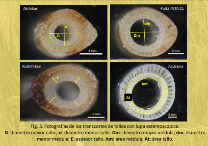 Treinta días luego de floración se tomaron tres tallos de plantas distintas para realizar mediciones de: longitud de panoja, tallo y entrenudos, peso seco del tallo, láminas foliares y panoja. Además, se establecieron relaciones de peso seco por longitud de panoja y peso seco por longitud de tallo. En otros tres tallos de cada genotipo, se determinó en el entrenudo a 10 cm del cuello: diámetro externo con vainas, masa requerida para producir el quiebre (MaQ; kg) y se calculó el momento de la fuerza de quiebre (MoQ = Fuerza [N] x distancia a la mitad del largo del entrenudo [m]) (Fig. 2). En el mismo entrenudo también se registraron los caracteres que se ilustran en la Fig. 3, mediante el programa Image J. Los datos se analizaron con: ANOVA, test LSD Fisher, correlación Pearson y Análisis de Componentes Principales (ACP).