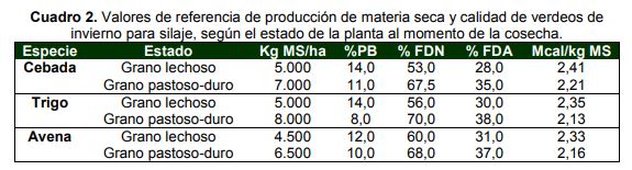 En general, se puede decir que estos cultivos permiten -además de incrementar la oferta total de reservas- contar en el verano con un forraje conservado para complementar la alfalfa o cubrir la falta de volumen cuando se terminan el maíz o el sorgo. Su inclusión en la dieta aportará fibra de buena calidad y proteína, dependiendo del momento de cosecha y de la nutrición del suelo. El volumen cosechado dependerá de la especie, el momento de corte y del manejo de los lotes. La calidad del forraje que se almacena será resultado de la especie (la cebada posee más calidad que el trigo y la avena y ésta última es algo inferior al trigo), y del estado reproductivo del cultivo al momento de la cosecha (grano lechoso, mayor calidad que grano pastoso-duro).