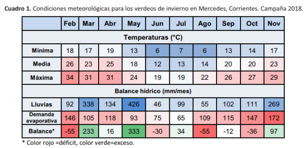 En este informe se resumen los resultados de la evaluación de cultivares de raigrás anual y avena de la campaña 2018, en la Estación Experimental Agropecuaria INTA Mercedes, Corrientes. Se comentan, además, las condiciones meteorológicas de la campaña y su relación con la implantación y productividad de los verdeos de invierno a nivel de lote de producción.