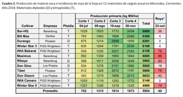Se sembraron con sembradora mecánica experimental, 12 materiales de raigrás anual en parcelas de 1,4 x 4 metros con diseño en bloques completos aleatorizados, 4 repeticiones y a una profundidad aproximada de 1 cm. La fecha de siembra fue 6 de abril y la fertilización de base fue de 107 kg FDA/ha. La fertilización nitrogenada total fue de 170 kg urea/ha, aplicados 70 al macollaje (mayo), 50 post 1° corte (julio) y 50 post 2° corte (agosto). Se realizó un análisis de varianza y el test de Tukey para detectar diferencias entre cultivares en producción y enfermedades, utilizando el programa Infostat (Di Renzo y col., 2016). El ensayo se implantó lentamente debido a las malas condiciones otoñales, y la cobertura general del ensayo al 1° corte fue en promedio de 59%. Se destacaron los materiales INIA Camaro, Winter Star II, Bar HQ y Maximus por presentar una cobertura superior al 80% en este momento, lo que se reflejó también en la producción al 1° corte. Se observó, al igual que en otros años, una tendencia a mayor producción al 1° corte en los materiales tetraploides vs los diploides (p<0,07). Con respecto a enfermedades, a pesar de la alta humedad y temperatura no se observó roya en ningún cultivar de raigrás en los 3 primeros cortes, recién al fin del ciclo se registró la enfermedad en varios materiales (Cuadro 2).