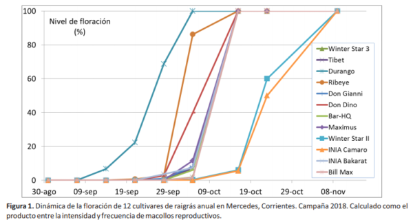 Con respecto a la producción total del ensayo, fue particularmente alta para un año desfavorable, casi 6 toneladas MS/ha. No obstante, el 65% de la producción primaria se dio en los cortes 3 y 4, en coincidencia con la mejora de las condiciones meteorológicas de fin de invierno/primavera. Otros factores que favorecieron la producción fueron la dosis relativamente alta de nitrógeno utilizada (97,5 kg N/ha) y las características del lote, que si bien no fue rastreado no tuvo problemas de compactación. Con respecto a la producción de los cultivares, hubo diferencias significativas del material Bar HQ únicamente sobre los materiales INIA Camaro y Winter Star II (p<0,05) No obstante, se debe destacar que las diferencias en el momento de floración tienen un importante efecto sobre la producción de materia seca. Como se observa en la figura 1, los materiales INIA Camaro y Winter Star II no florecieron sino hasta mediados de octubre, mientras que el resto de los materiales tetraploides ya habían alcanzado el 100% de la floración en este momento. A su vez, los materiales diploides evaluados comenzaron a florecer antes que los tetraploides. El cultivar Durango fue el más precoz, lo que estuvo asociado a su alta producción en el corte 3.