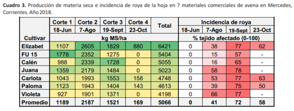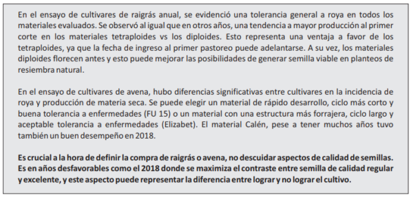 En referencia a las malezas, fue un año favorable para la aparición de especies de ciclo inverno-primaveral, pero también se observó germinación otoñal de malezas estivales de hoja ancha, estimuladas por las altas temperaturas. En lo que refiere a enfermedades, en raigrás es raro observar actualmente lotes con problemas de roya de la hoja que no puedan solucionarse con manejo del pastoreo, a pesar que en 2017 y 2018 se dieron condiciones muy propicias para la enfermedad. Sí se observaron en 2018 problemas sanitarios en lotes de raigrás de resiembra muy adelantados, con pérdida de material foliar e incluso plantas durante el período de anegamiento otoñal y debidas probablemente a hongos (Ing. Agr. Esteban Bonapelch, comunicación personal). En avena blanca, sí se registraron problemas de roya que comprometieron la producción de lotes comerciales tanto en 2017 como en 2018.