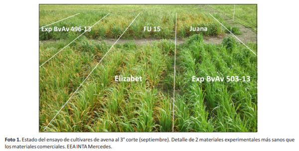 Se sembraron 7 materiales comerciales de avena y 10 experimentales, con sembradora mecánica en parcelas de 1,4 x 4 metros, diseño en bloques completos aleatorizados, 3 repeticiones y a una profundidad aproximada de 1 cm. La fecha de siembra fue 4 de abril y la fertilización de base fue de 107 kg FDA/ha. La fertilización nitrogenada total fue de 220 kg urea/ha, aplicados 70 al macollaje (mayo), y 50 post 1°, 2° y 3° corte (junio, julio y septiembre). Al igual que en raigrás las condiciones otoñales afectaron el crecimiento inicial de avena. Sin embargo, no hubo pérdida de plantas por anegamiento, ya que las mismas estaban establecidas para fin de abril. El primer corte se hizo a mediados de junio y sin aparición de roya de la hoja, la cual si se observó a partir de julio en todos los materiales comerciales. Los materiales FU 15 y Calén tuvieron estadísticamente menor incidencia de roya que Violeta, Juana y Carlota en los cortes 2 y 3 (p<0,05) En producción total se destacaron Elizabet y FU 15, el primer material fue superior estadísticamente a Violeta (p<0,05) y se caracterizó por presentar un ciclo largo con floración tardía, en comparación con FU 15 que ya presentaba macollos encañados al primer corte. Con respecto a 10 los materiales experimentales, que son selecciones más recientes que los materiales comerciales, hubo 3 que fueron más sanos que todos los materiales comerciales y estadísticamente más productivos excepto con Elizabet y FU15 (p<0,05 Foto 1).