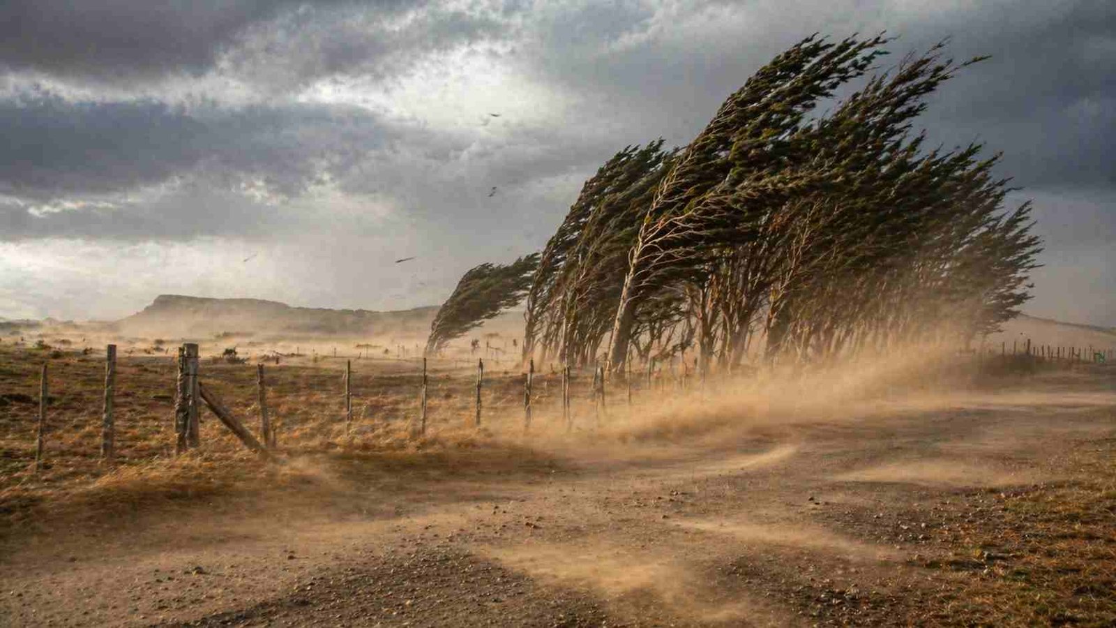 Fuertes ráfagas de viento en campo patagónico con árboles inclinados y polvo en suspensión