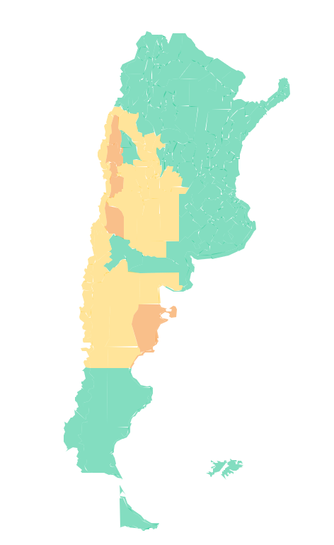Mendoza: Zona baja de Malargüe – Cordillera de San Carlos – Cordillera de Tunuyán – Cordillera de Las Heras – Cordillera de Luján de Cuyo – Cordillera de Tupungato – Este de Las Heras – La Paz – Lavalle – San Martín – Santa Rosa – General Alvear – Zona baja de San Rafael