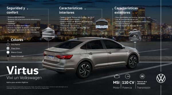 Volkswagen Argentina inició la comercialización de Virtus MY22, que incorpora actualizaciones que le brindan mayor seguridad, conectividad y confort. La principal novedad se da en el sistema multimedia VW Play de 10”, que a partir de ahora se encontrará disponible en las versiones Comfortline AT, Highline AT y GTS del Volkswagen Virtus. Además, el nivel de equipamiento Highline suma llantas de 17”, asientos de cuero ecológico, Detector de fatiga y Sistema de monitoreo de presión de neumáticos. Por su parte, la versión Comfortline agrega también apoyabrazos novedadedelantero central. Martín Massimino, Director Comercial del Grupo Volkswagen Argentina, sostuvo: “En VW trabajamos todos los días para ofrecer vehículos aún más modernos, seguros y confortables. Y estas novedades que implementamos en Virtus MY22 tienen ese objetivo: aumentar la tecnología, sin descuidar el confort y poniendo a la seguridad como un pilar principal”. Thomas Owsianski, Presidente y CEO del Grupo Volkswagen Argentina, destacó que “Virtus es un excelente vehículo que le otorga a la gama de productos Volkswagen unas características muy valoradas por nuestros clientes: gran espacio interior, confort y seguridad”. Con la incorporación de VW Play en la versiones Highline AT y GTS, y en combinación con el tablero Active Info Display, el Volkswagen Virtus ofrece dos islas digitales de 10” que le brindan al usuario toda la información que precisa de una forma clara y 100% adaptable a sus requerimientos.El innovador sistema multimedia VW Play está compuesto íntegramente por botones sensibles al tacto, y permite vincular los teléfonos a través de App Connect de forma inalámbrica (exclusivo para dispositivos iOS). Además, posee 10 GB de memoria para descargar aplicaciones.