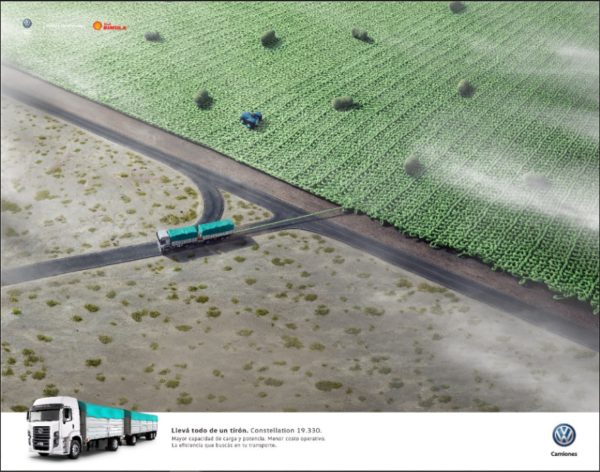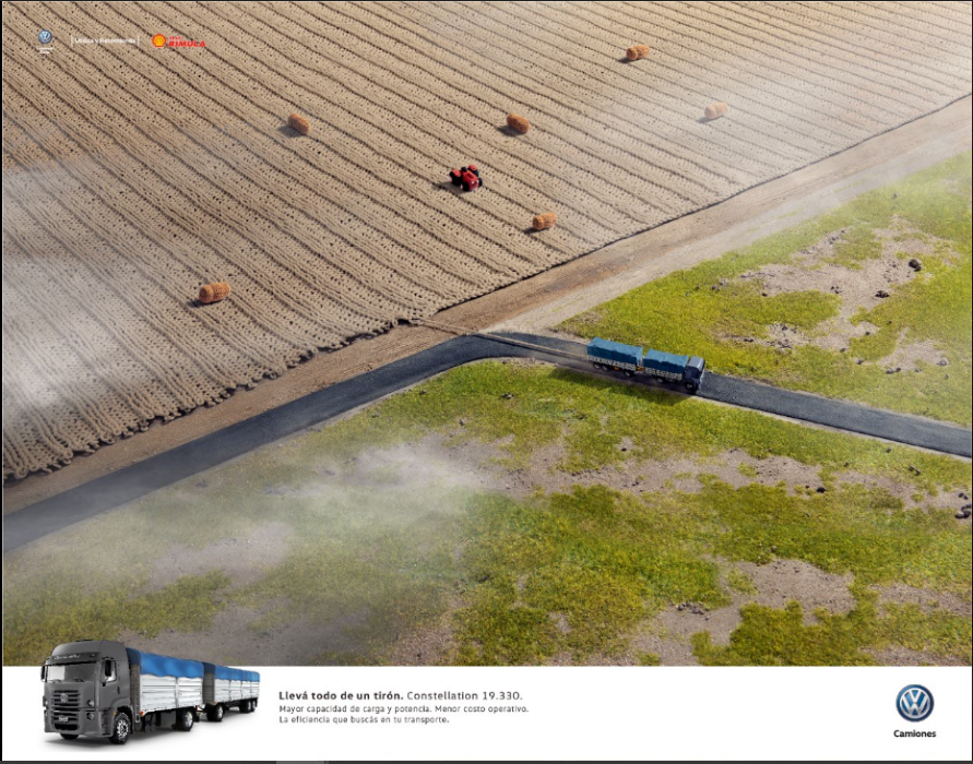 El modelo Volkswagen Constellation 19.330, que “realiza el trabajo” con una economía comprobada y con la simplicidad que requieren muchas operaciones; es el camión ideal para configuración chasis con acoplado. En cada pieza de la campaña se puede ver cómo los camiones logran llevarse todo de un tirón.
