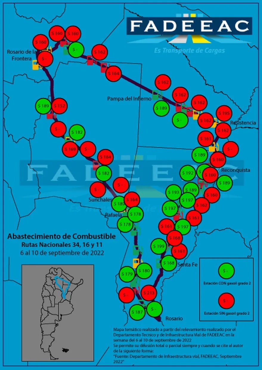 Un equipo de técnicos de Federación Argentina de Entidades Empresarias del Autotransporte de Cargas (Fadeeac) recorrió 3.050 km para relevar la situación en las rutas nacionales 34, 16 y 11. Son las carreteras troncales que atraviesan las provincias de Santa Fe, Santiago del Estero, Tucumán, Salta, Jujuy, Chaco y Formosa. La recorrida concluyó en que “en 56% de las estaciones de servicio, la oferta de ese combustible era nula o restringida”, con un valor que “oscilaba entre $160 y $200 por litro, y la disponibilidad era directamente proporcional al costo: a menor costo, menor disponibilidad”.