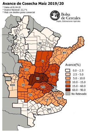 En la provincia de Córdoba la cosecha continúa brindando muy buenos rindes en gran parte de los departamentos. Por otro lado, los cuadros tardíos y de segunda ocupación se encuentran finalizando el llenado de granos con una baja presión sanitaria y de plagas. Hacia las zonas Oeste de Buenos Aires-Norte de La Pampa, Cuenca del Salado y el Centro de Buenos Aires la recolección comenzaba a tomar buen ritmo, pero las últimas lluvias relevadas demoraran las labores por falta de piso para el tránsito de las máquinas y el incremento en la humedad de los granos.