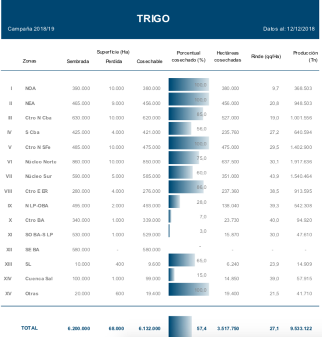 La cosecha trigo continúa avanzando sobre el centro y sur del área agrícola con rendimientos muy heterogéneos y pérdidas en el potencial de producción. Las últimas heladas registradas sobre gran parte de la provincia de Buenos Aires y las fuertes tormentas con caída de granizo acumuladas en el norte de La Pampa y sur de Córdoba, provocarían una merma en la productividad de los lotes más afectados que se encontraban entre el final del llenado de grano y comienzos de madurez fisiológica. Por otra parte, a medida que progresa la recolección en el Núcleo Norte, región que concentró el 14 % de la superficie implantada con el cereal, los rendimientos se ubican por debajo de las expectativas relevadas al inicio de la campaña. Bajo este escenario, la proyección de producción para el ciclo 2018/19 se ajusta a 19.000.000 de toneladas, cifra que reflejaría un nuevo incremento interanual del 7 % (Producción Trigo 2017/18: 17,75 MTn).