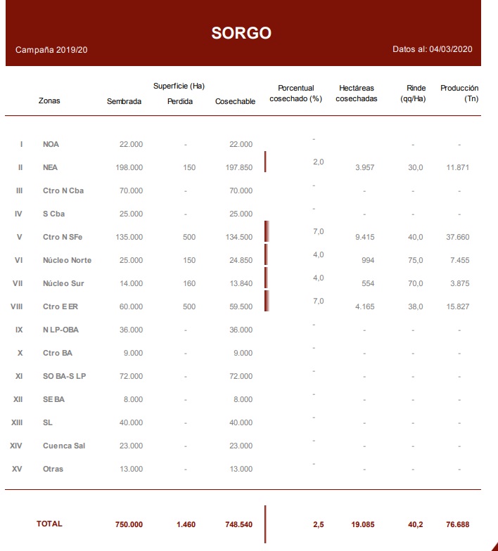 Desde nuestro informe previo, la recolección de cuadros de sorgo granífero comenzó en el centro del área agrícola nacional. Los mayores avances de cosecha se registraron en las provincias de Entre Ríos y Santa Fe. A la fecha el avance de las labores se ubica en el 2,5 % de un área estimada para la campaña 2019/20 en 750.000 Ha., un 2,8 % superior al ciclo previo (Superficie campaña 2018/19: 730.000 Ha.). Los rindes recolectados se encuentran por sobre los promedios zonales, por lo cual mantenemos la actual estimación de producción de 2,5 MTn para el presente ciclo.