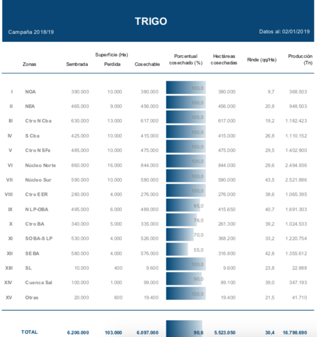 A la fecha, el 90,6 % del trigo implantado en Argentina ya se encuentra recolectado con un rendimiento medio nacional que ascendió a 30,4 qq/Ha. Los mayores progresos de cosecha se relevaron sobre el centro y sur de Buenos Aires, donde los rendimientos se mantienen dentro de las expectativas iniciales. En números absolutos, se alcanzó un volumen parcial de 16.800.000 de toneladas, con un leve retraso interanual de 1 punto porcentual. A su vez, la proyección de producción se mantiene en 19.000.000 de toneladas, sujeta a la evolución del final de la cosecha en el sur de Buenos Aires y La Pampa.