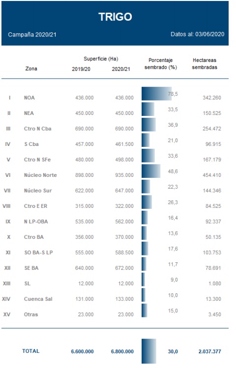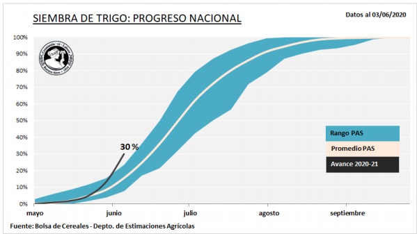 La siembra a nivel nacional ya cubrió el 30 % del área estimada para la campaña 2020/21. Esto refleja un avance anticipado no solo en comparación al ciclo anterior, sino también respecto a los máximos históricos. En la región del NOA y en la provincia de Córdoba, la falta de lluvias continúa acentuando la escasez de humedad en el estrato superficial del suelo, con lo cual el avance de las maquinas ha empezado a desacelerarse a la espera de las precipitaciones pronosticadas para este fin de semana.