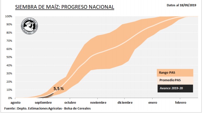 La siembra ya cubre el 5,5 % de las 6,2 MHa estimadas para la campaña en curso. El avance intersemanal fue de 3,3 puntos porcentuales y se mantiene un adelanto interanual de 0.1 puntos porcentuales.