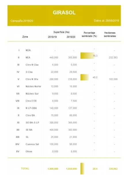 Las labores de implantación de la oleaginosa avanzan a buen ritmo, habiendo superado las 330 mil hectáreas sembradas a nivel nacional. En el NEA se lleva incorporado el 76,3 % de la superficie proyectada para este ciclo. La ausencia de lluvias en la zona ha permitido alcanzar un progreso intersemanal de 22,3 puntos porcentuales. Sin embargo, a esta altura del año, en la campaña 2018/19 ya se había sembrado el 95% del