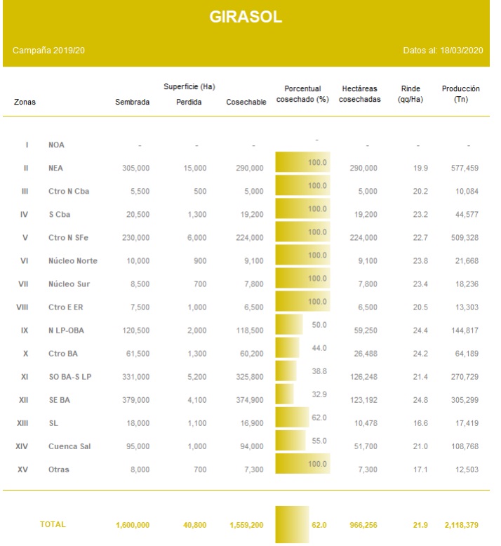 El 62 % del área ya se ha recolectado. El progreso intersemanal de cosecha fue de 8,7 pp. El rinde medio se ubica en 21,9 qq/Ha. La proyección de producción permanece en 3,4 MTn.