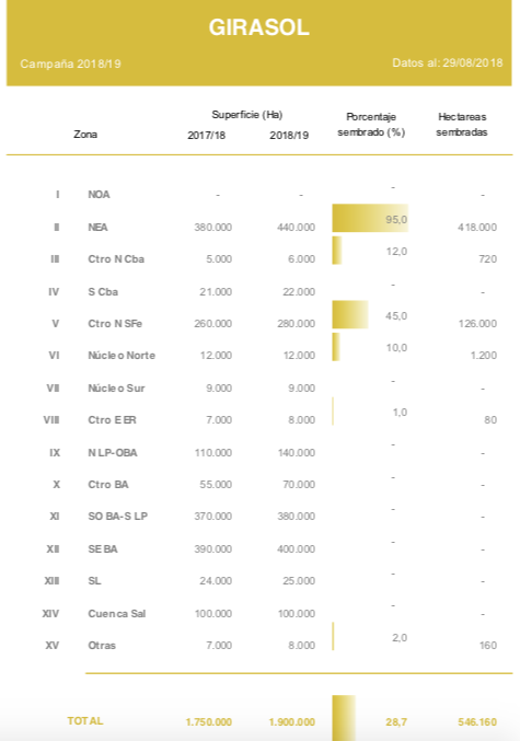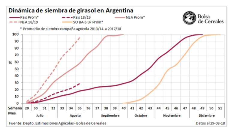 La siembra de girasol 2018/19 continúa avanzando sobre las regiones del norte del país. Luego de registrarse un progreso intersemanal de 6,9 puntos porcentuales, el área implantada superó el 28,7 % de las 1.900.000 hectáreas proyectadas para el presente ciclo. A su vez, las labores de siembra se encuentran próximas a finalizar en la región del NEA, mientas tanto se relevaron las primeras incorporaciones de lotes tempranos en el Centro-Este de Entre Ríos.