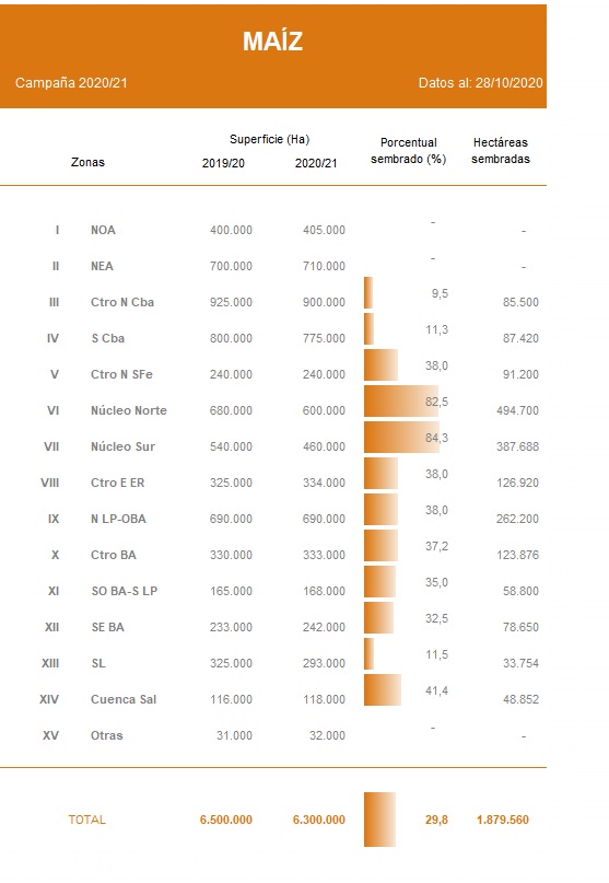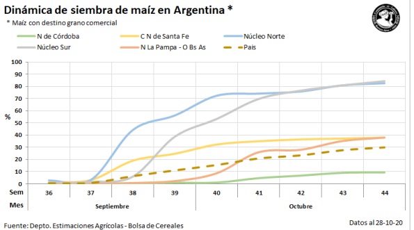La siembra ya cubre el 29,8 % de la actual proyección de 6,3 MHa para el ciclo 2020/21. El avance intersemanal fue de 2,3 pp y mantiene una demora de 10,4 pp en comparación a la campaña previa.